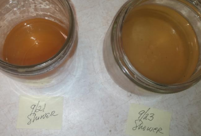 rusty water in #6. Large rust particles, orange scum, and/or brown bits floating in